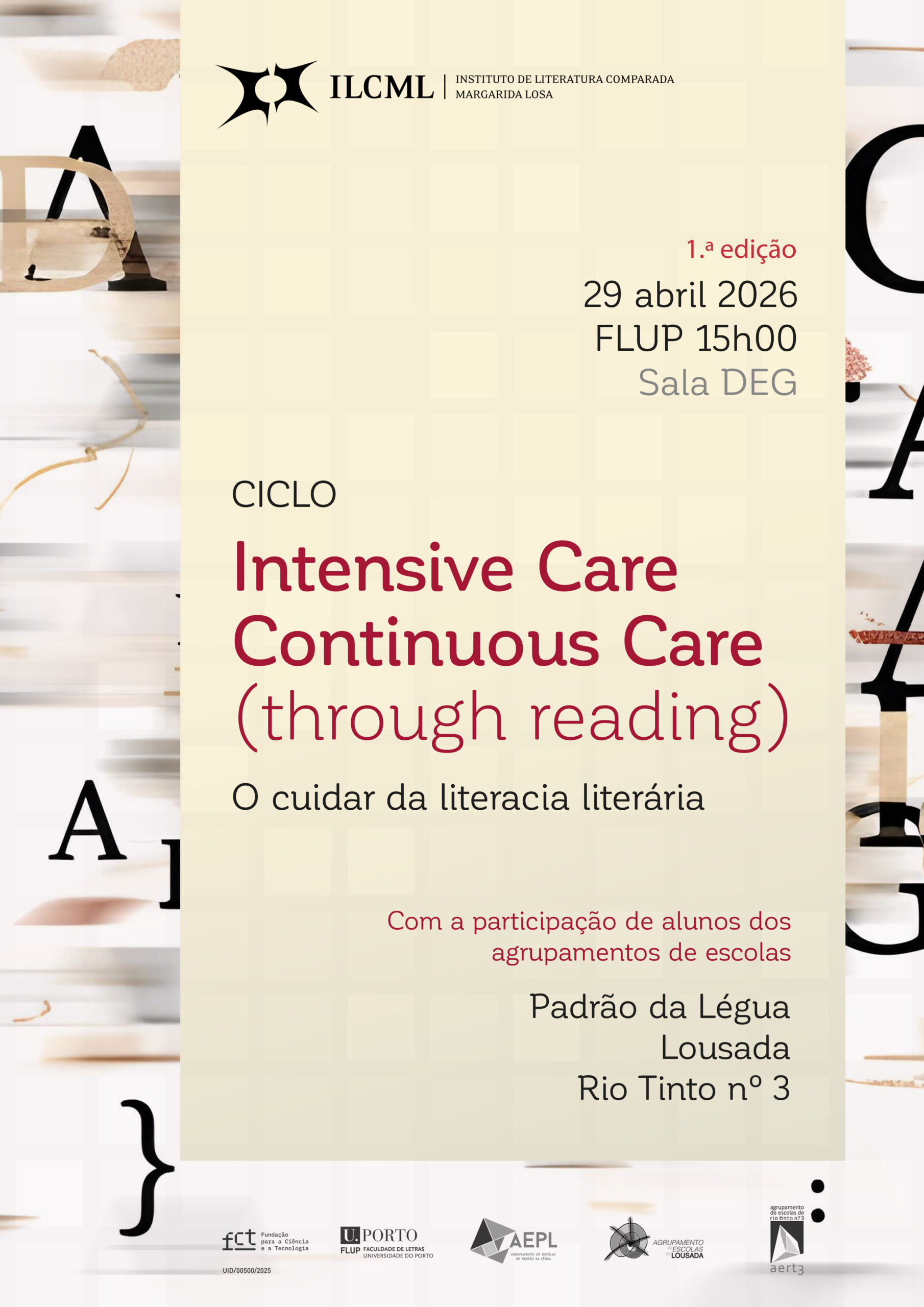 O Instituto de Literatura Comparada Margarida Losa promove, no dia 29 de abril de 2026, às 15h00, na Sala do Departamento de Estudos Germanísticos (DEG) – FLUP, o primeiro workshop do ciclo Intensive Care, Continuous Care (through reading).