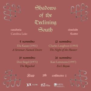 Premissa: Este ciclo tem como objetivo explorar o género gótico sulista numa perspetiva cinematográfica. Conhecido pela sua atmosfera sombria, a exploração destemida de personagens com morais questionáveis e o seu sempre-presente cenário decadente, este ciclo irá abordar como estes temas são apresentados e interpretados por meio de quatro filmes diferentes, que prometem uma jornada turbulenta, mas envolvente, por este género.